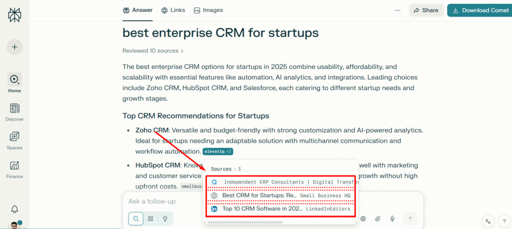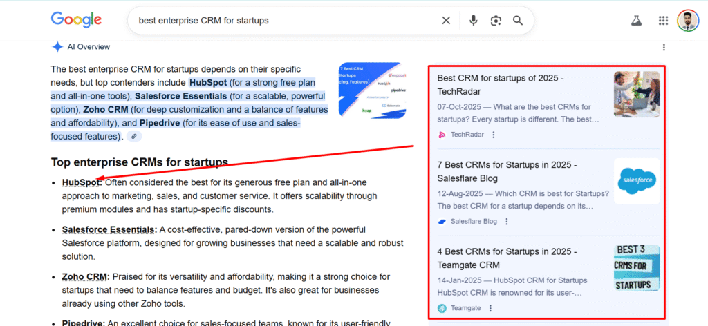 For example, search for “best enterprise CRM for startups”. on Perplexity AI or Google. You will see: